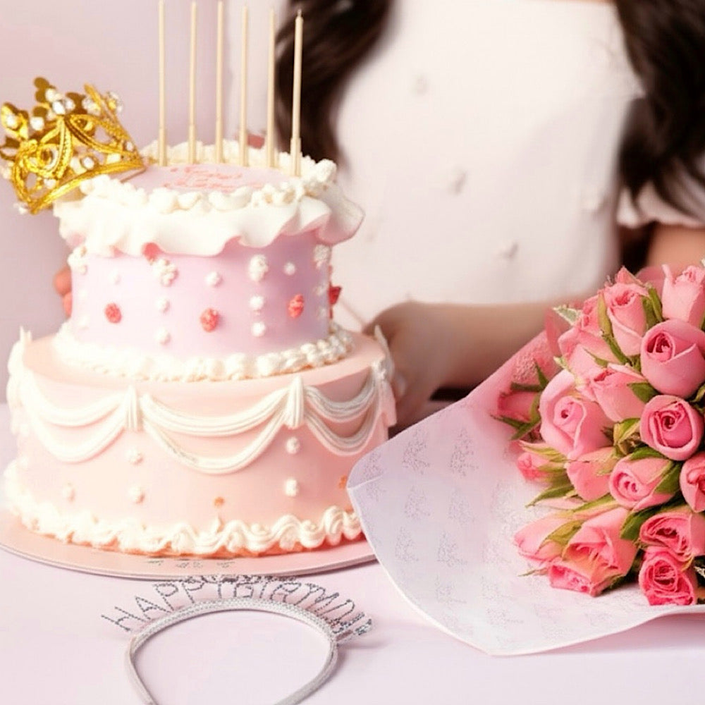يحتوي على كعكة و شموع و تاج و بوكية زهور