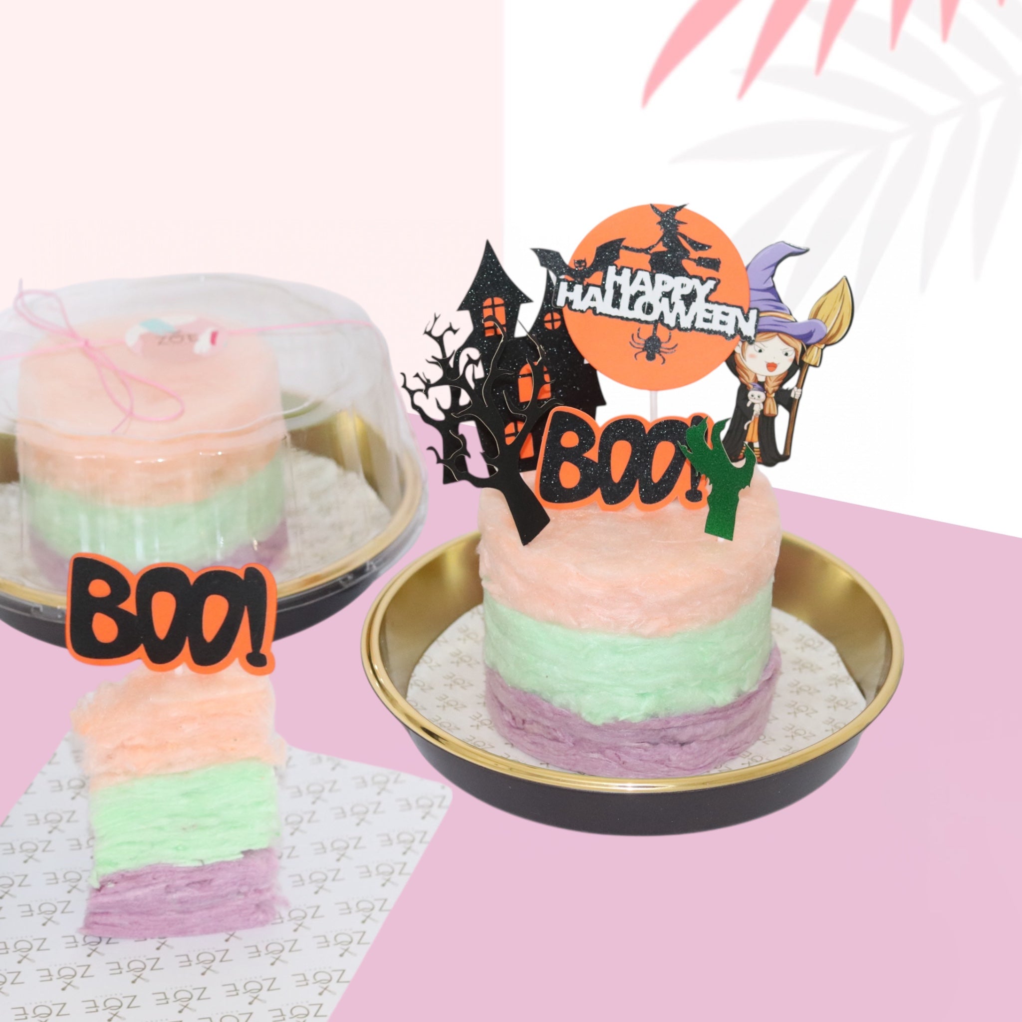 Cotton Candy Cake size (13x10 cm) A dreamy hand-spun cotton candy cake made entirely from fluffy sugar! Soft sweet and magical - perfect for your Halloween celebration, it comes with Halloween Toppers