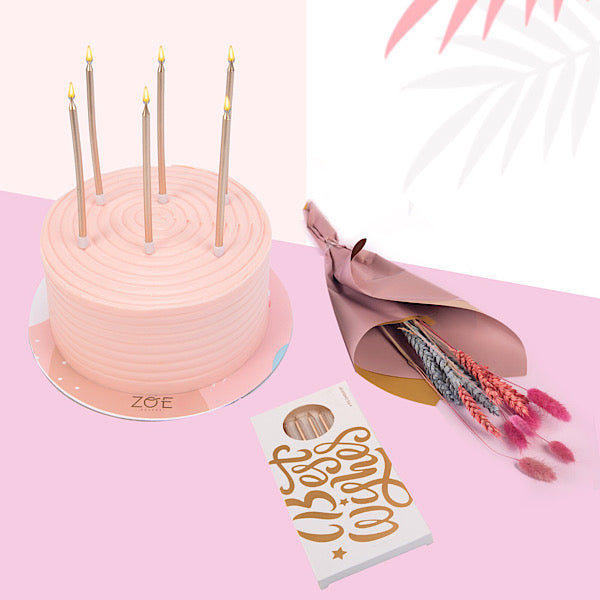 كعكة مع ٦ شمعات ذهبية و بوكية زهور